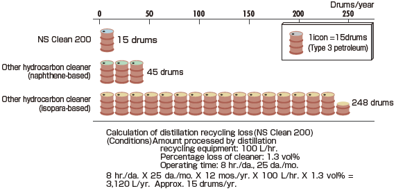 NS Clean©'s boiling point is far different than that of ordinary process oil (dirt material), giving it a high separation efficiency. Therefore, even when NS Clean© is repeatedly recycled by distillation, little of it is lost and stable product quality can always be maintained.