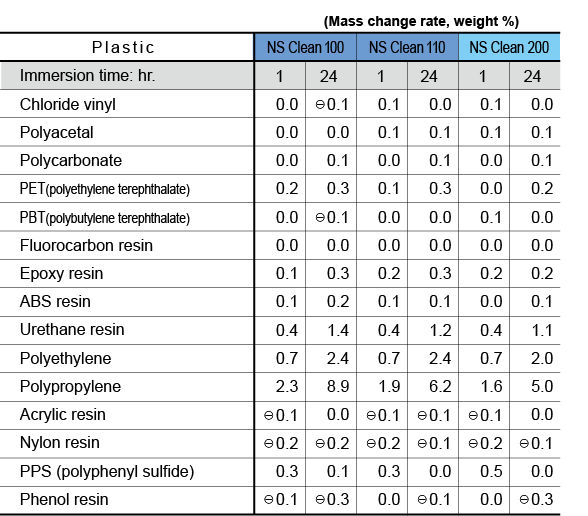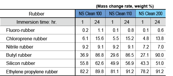 As the data below shows, the cleaners in the NS Clean Series have almost no effect on many kinds of materials. However, they may affect rubber and certain plastics, about which it is necessary to exercise mindful.